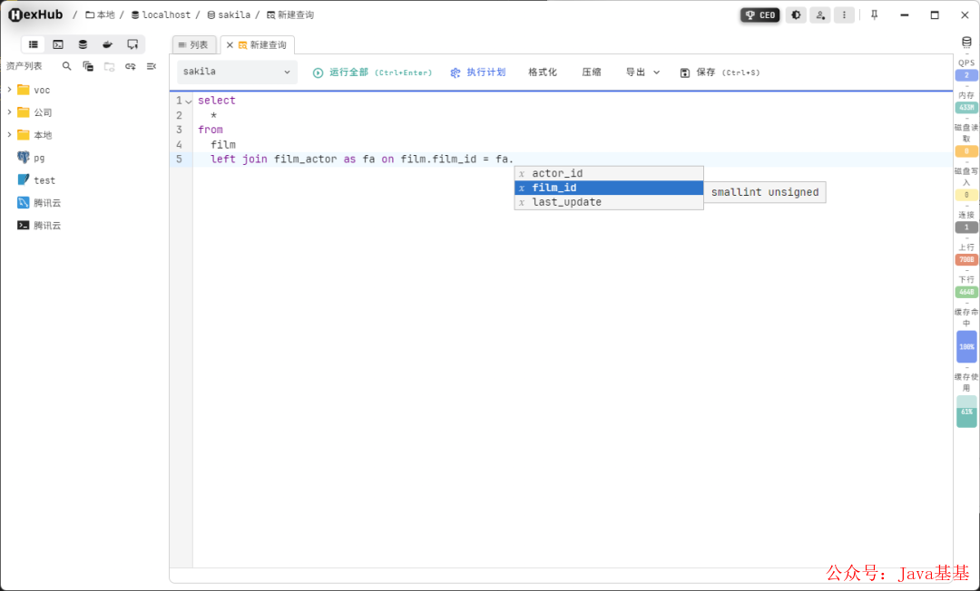 HexHub 智能 SQL 编辑器提供了自动补全、语法高亮、代码格式化、流式查询、执行计划、查询结果导出等功能。