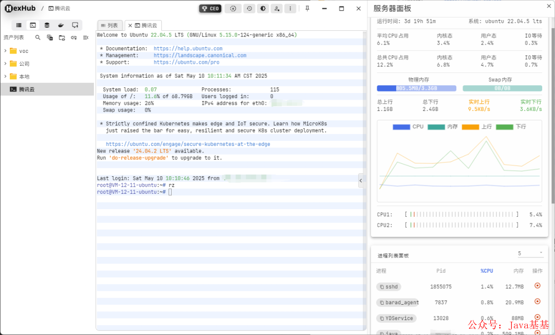 服务器实时面板提供网速、CPU、内存、进程列表、磁盘挂载列表等信息。