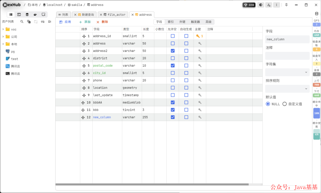 HexHub 表结构编辑器实现了字段编辑、索引编辑、类型推导、内联编辑、修改和新增着色、拖拽排序等功能。