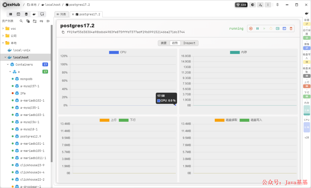 Docker 容器面板支持容器 CPU、内存、IO 实时趋势图。