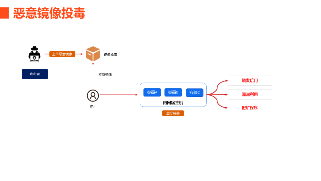 攻击者会将恶意镜像上传到公开仓库,或者入侵本地仓库,将恶意镜像伪装成正常镜像,从而完成镜像投毒的动作。当用户拉取到恶意镜像并运行容器时,镜像中的恶意代码就会在容器启动过程中被执行,进而触发后门、漏洞利用、挖矿等恶意行为。