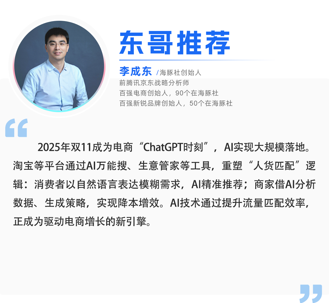 而眼下,AI助手带来了一种前所未有的购物方式,它可能会在未来几年扮演类似曾经“货找人”和直播电商的增长角色。而首次全网大规模应用AI的这届双11,很可能就是行业的“ChatGPT时刻”。