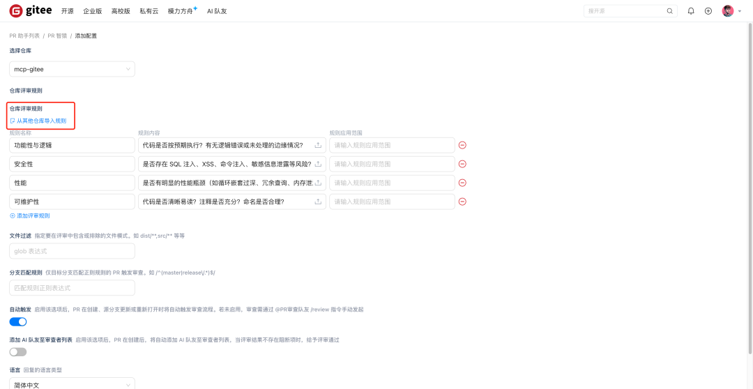 多个项目间有重复评审需求?现在,您可以直接从已有仓库导入评审规则,复用配置逻辑,避免重复维护,特别适合拥有多个子仓库的大型项目或企业用户。