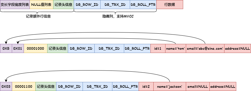 变长字段宽度列表保存变长字段非空值长度。从上图可以看到,变长字段宽度列表存放的列宽度顺序和数据表中的列顺序相反,也就是说变长字段宽度列表逆序存放列宽度。