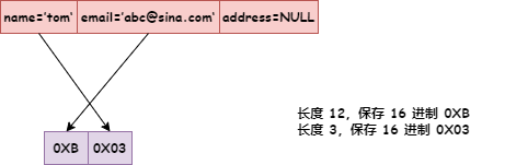 同样,NULL 值列表也是逆序保存,当该值是 NULL 时,用二进制 1 表记,否则就保存二进制 0。