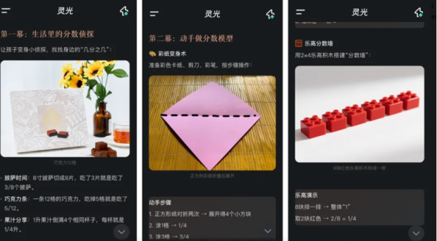 结果用了灵光之后,这些问题一下都解决了。“比如讲分数这个概念,它是怎么讲的呢?先给孩子举几个生活里的例子,比如分披萨啊,分巧克力条啊这些,让孩子对分数有个基本概念。然后它还会给你设计一些小游戏,有图片一步步教你,用卡纸、剪刀、彩笔这些东西,制作分数模型。最后它居然还会用孩子喜欢的东西,比如乐高积木来举例子,让孩子一边玩一边理解分数,这个简直就是一个优秀数学老师的配置啊!”姚女士有些激动地说。