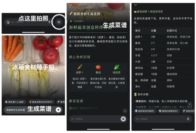 而灵光的这些功能当然并非只针对儿童。对于成年人来说,它也是一个非常得力的生活助手,比如用“灵光开眼”看看你冰箱里的食材,就能根据你现有的食材帮你定制一个菜谱,一步一步照着做,轻松小白变大厨。