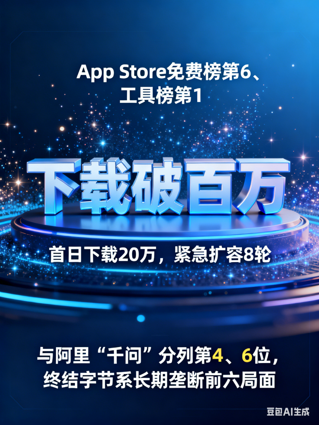 蚂蚁“灵光”App上线4天下载破百万,登App Store免费榜第6、工具榜第1;首日下载20万,紧急扩容8轮;与阿里“千问”分列第4、6位,终结字节系长期垄断前六局面。