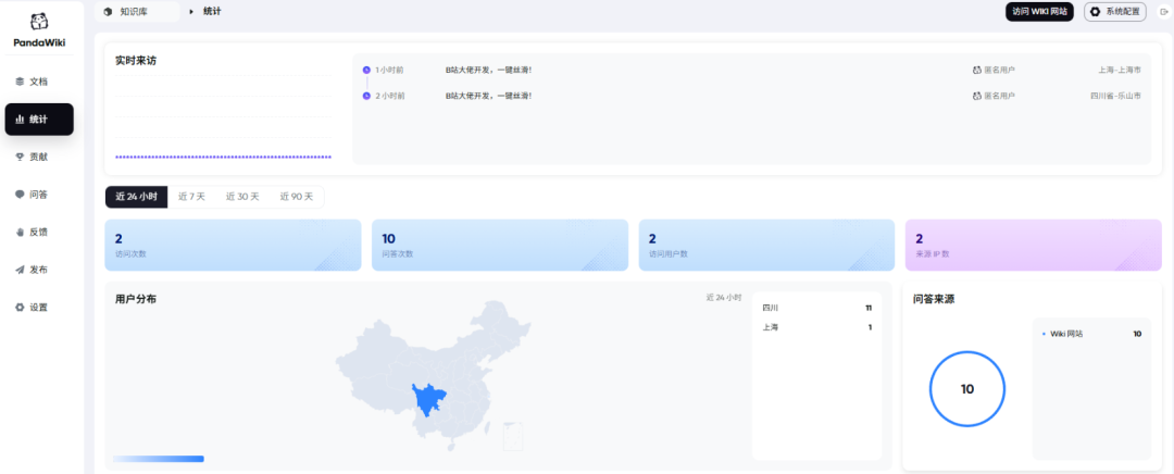 发布后,PandaWiki中有个后台统计,可以对你访问信息进行进行统计。