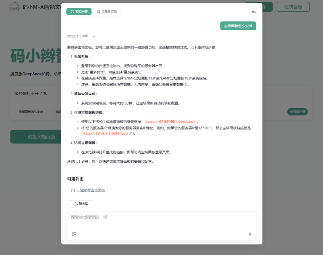 搜索一个问题进行提问,我提问的是关于宝塔面板怎么安装只搜索文章相关资料也可以