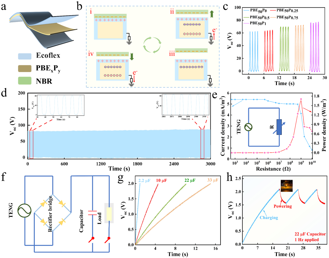 图4(a)TENG结构示意图;(b)TENG的工作原理;(c)PBE50P1-TENG的Voc;(d)PBE50P1-TENG的稳定性;(e)PBE50P1-TENG的功率密度;(f)基于PBE50P1-TENG负载电路图;(g)PBE50P1-TENG给电容器充电;(h)PBE50P1-TENG的充放电。