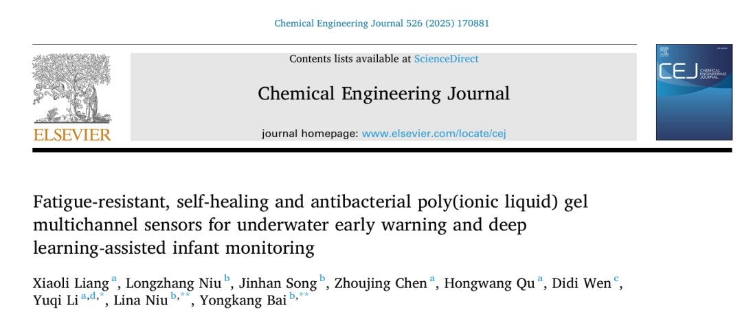 相关研究成果以“Fatigue-resistant, self-healing and antibacterial poly(ionic liquid) gel multichannel sensors for underwater early warning and deep learning-assisted infant monitoring”为题,发表于《Chemical Engineering Journal》期刊。