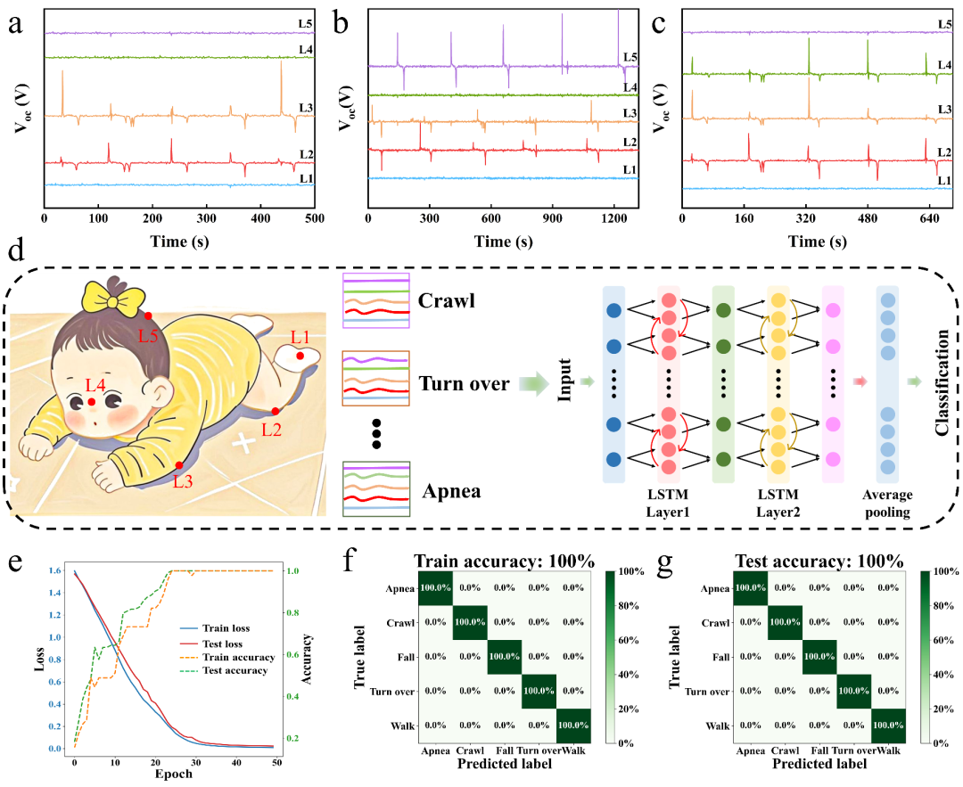 此外,还可将自供电压力传感器置于婴儿的关键身体部位(膝盖、手肘、后脑勺等),结合LSTM深度学习算法,实现对爬行、翻身、窒息等状态的实时识别与预警,系统分类准确率达100%(图6)。