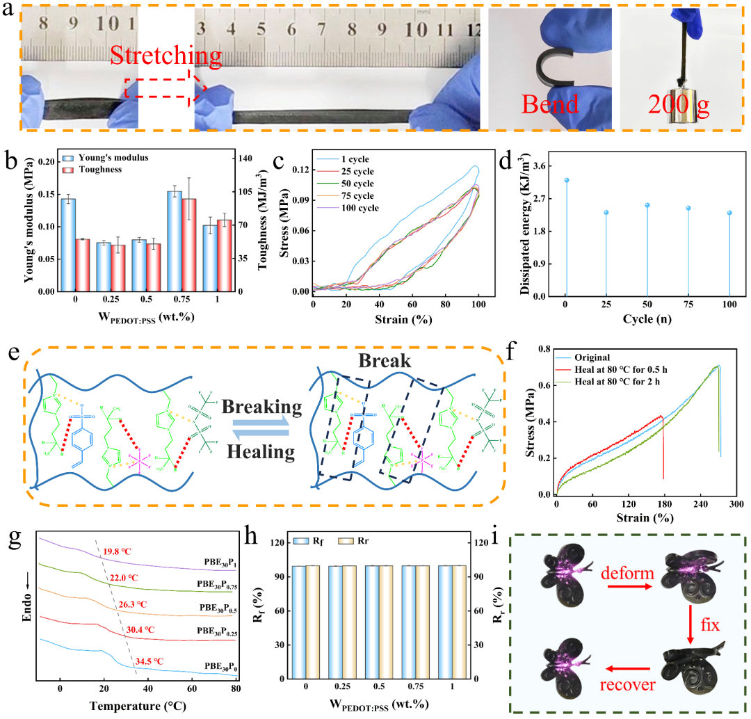 图2(a)PIL凝胶的拉伸、弯曲、提取重物状态;(b)PBE50P1的杨氏模量和韧性;(c)PBE50P1拉伸循环;(d)PBE50P1耗散能;(e)PBE50P1的愈合机理;(f)PBE50P1的愈合性能;(g)DSC测试;(h)Rf和Rr;(i)近红外光响应形状记忆示意图。