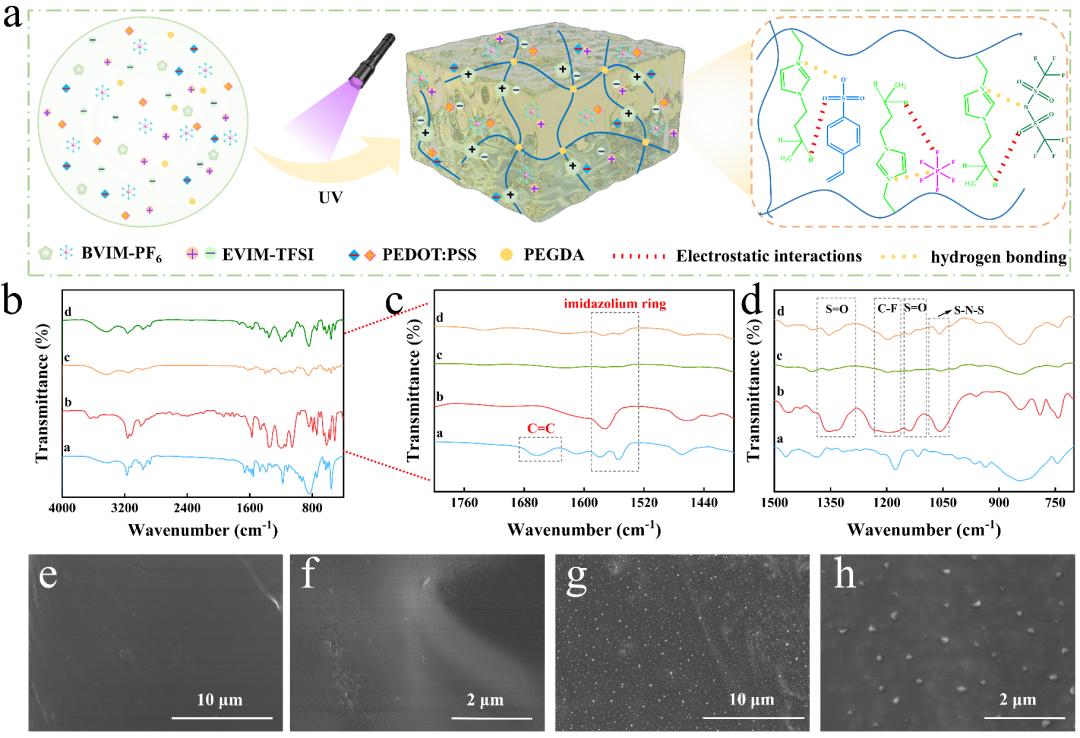 图1展示了PIL凝胶的制备流程和基本表征。选择具有强静电相互作用的1-乙烯基-3-丁基咪唑六氟磷酸盐(BVIM-PF6)作为聚合单体,1-乙基-3-甲基咪唑双三氟甲磺酰亚胺盐(EVIM-TFSI)则作为溶剂,聚(3,4-