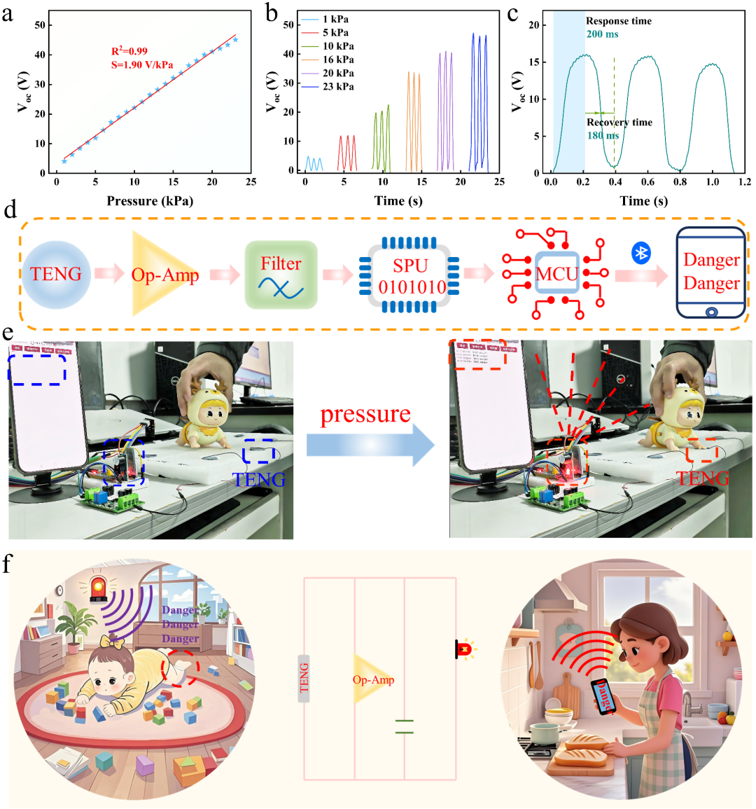 图5为基于TENG构建的自供电压力传感器,其S值达到1.90 V/kPa,且具有快速的响应时间(200 ms)。将其与微控制器结合,为婴儿构建了一个安全活动区域,当婴儿接近危险区域时,自动触发声光报警并通过蓝牙通知监护人。