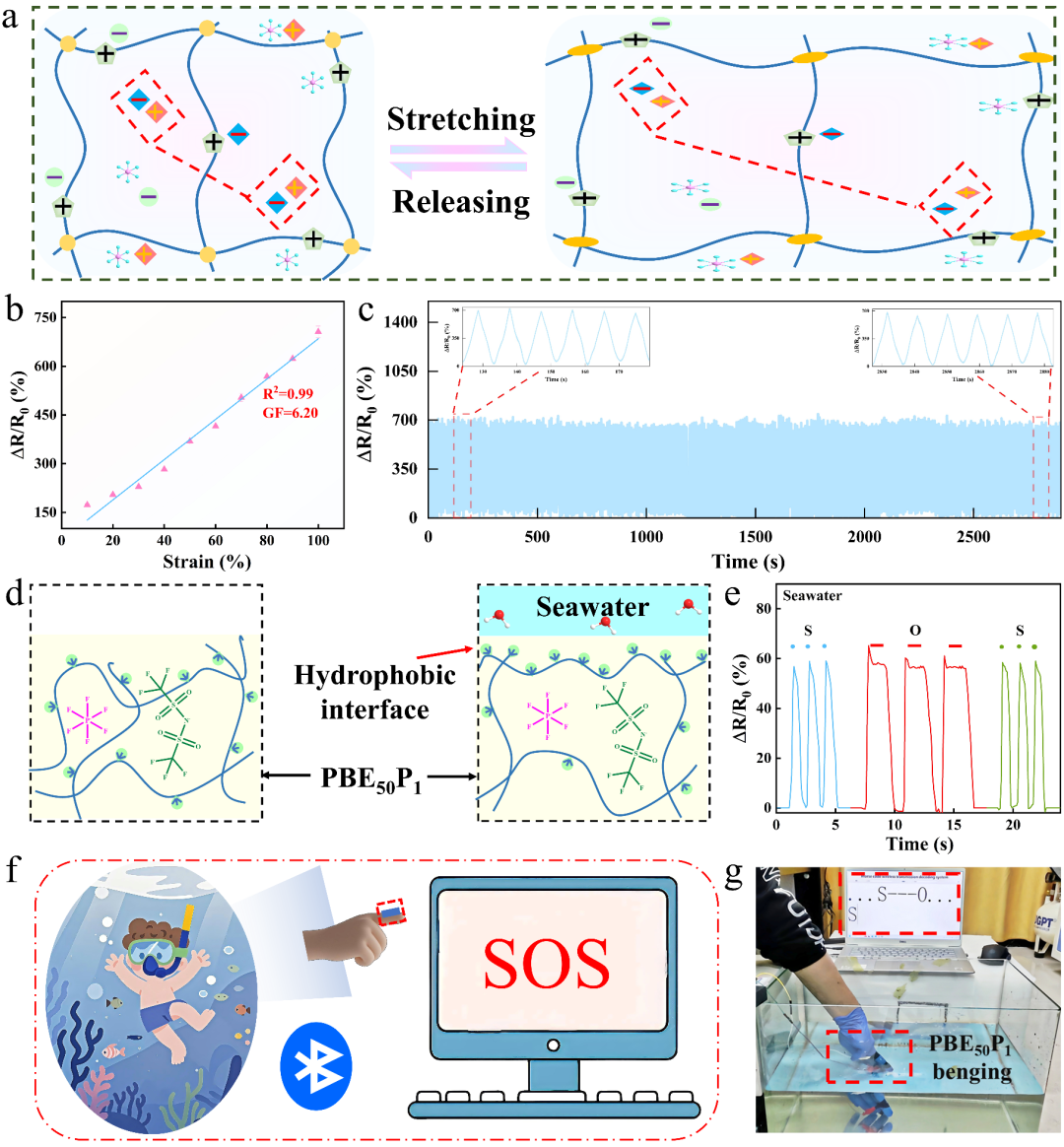 图3(a)PBE50P1的传导机制;(b)PBE50P1的GF;(c)PBE50P1的ΔR/R0稳定性;(d)PBE50P1的疏水机理;(e)SOS;(f)水下传输示意图;(g)水下传输实物图。
