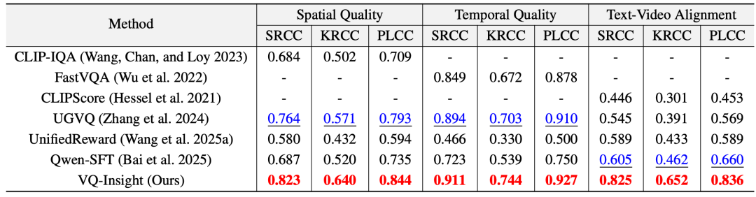 VQ-Insight 将“推理式+强化学习”思路应用于 AIGC 视频画质理解任务中,在偏好比较、多维度画质打分与自然视频质量评估等任务上均取得了突破性表现。通过渐进式视觉质量强化学习框架与创新的时序奖励机制,VQ-Insight 能够以极少的数据实现强泛化和强解释性,精准捕捉视频的空间清晰度、动态一致性、内容真实性等多维度质量特征。更重要的是,VQ-Insight 已能直接用于生成模型的后训练,成为生成视频训练的可插拔奖励与偏好模块,把“看得准”转化为“生成得更好”,为未来的视频生成模型带来更稳定、更符合人眼感知的画面质量,为下一代 AIGC 视频生成技术的发展奠定了关键基础。