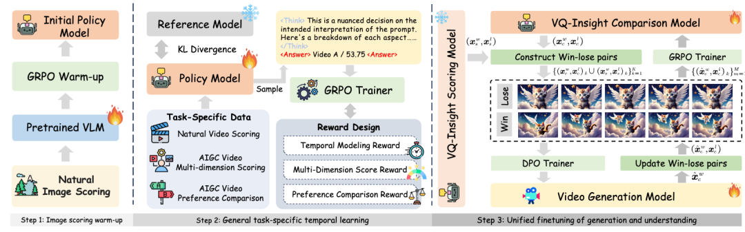 此前,北京大学与火山引擎多媒体实验室联合提出了首个基于强化学习训练的多模态大模型图像画质理解方案 Q-Insight。该方法摆脱了对大规模文本标注的依赖,充分挖掘大模型的推理潜力,使其能够深入思考图像质量背后的本质因素。然而,将这一思路扩展到 AIGC 视频评估仍面临新的挑战,即:1)如何更有效地激发大模型的时序感知能力与多维度画质理解能力;2)如何建立评估模型与生成模型的反馈互动,使两者在优化过程中获得动态增强,相互促进。