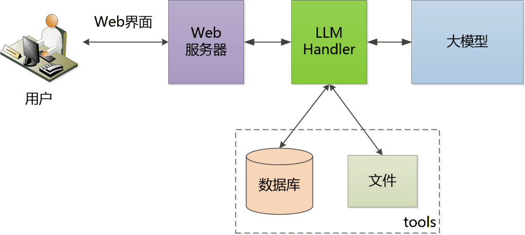 用户直接访问的就是个传统的服务器,核心在于一个叫 LLM Handler 的组件。