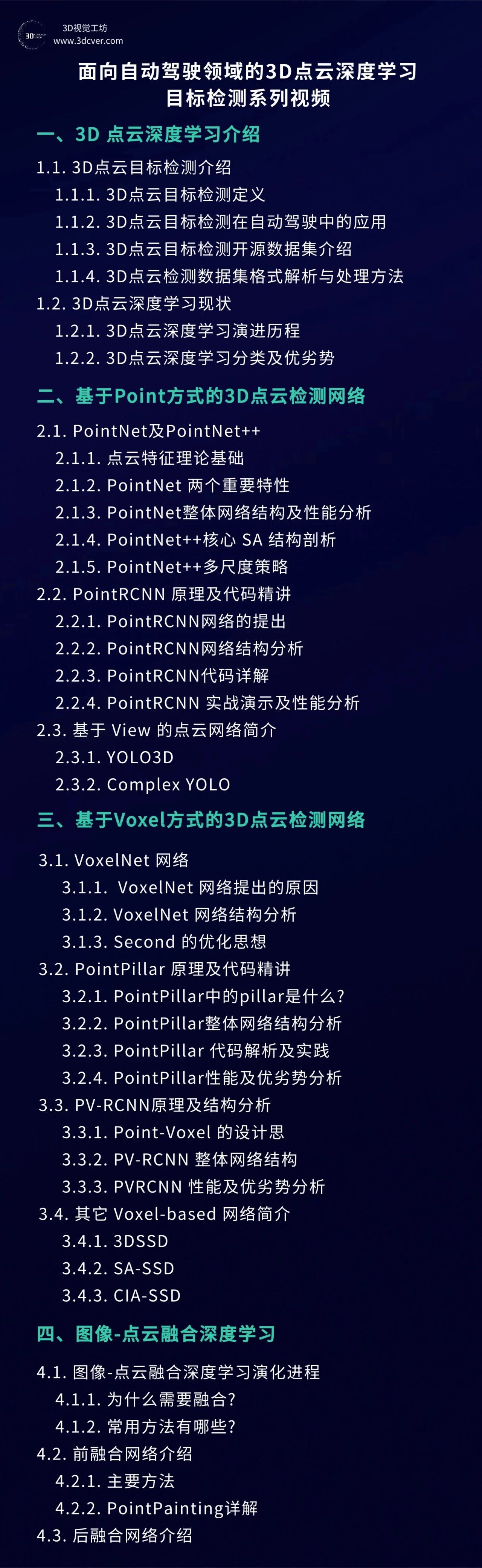 本视频教程以3D点云深度学习为主,对Point-based和Voxel-based系列的3D目标检测网络架构进行系统剖析和代码梳理,助力各位同学在点云深度学习更快的入门和更深的理解。