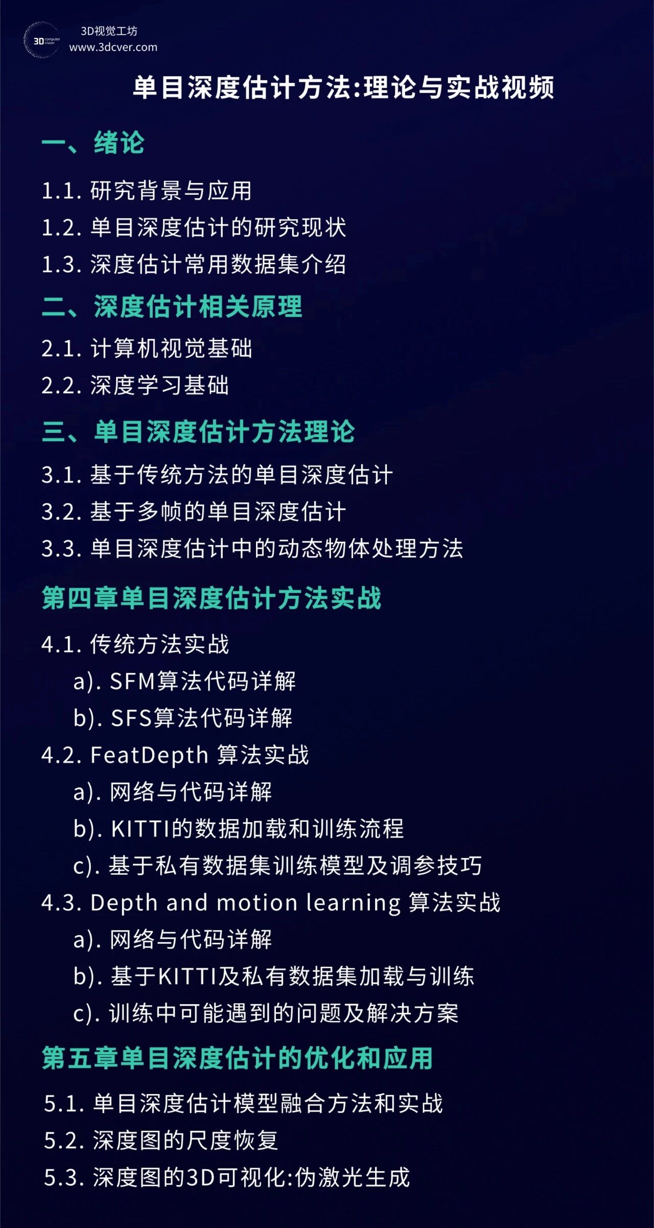视频教程主要分为两大部分:理论篇和实战篇,由于有监督方法的深度真值获取困难,且无监督方法的效果与有监督方法几乎相当,我们将课程的重心放在了无监督方法上。