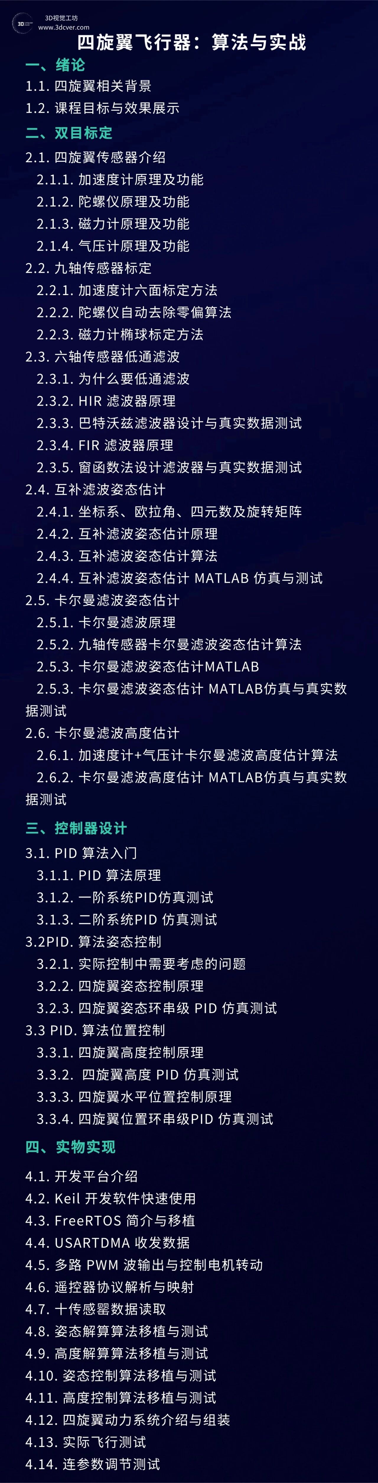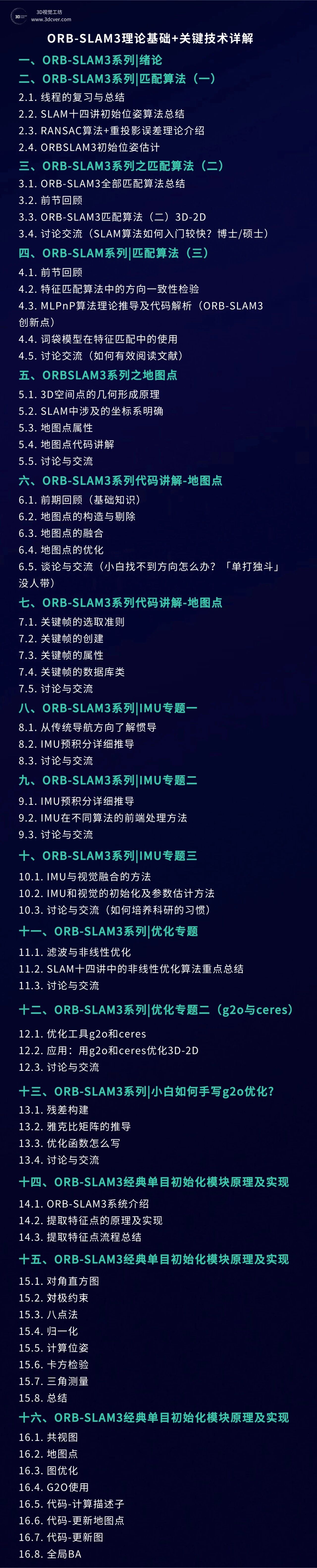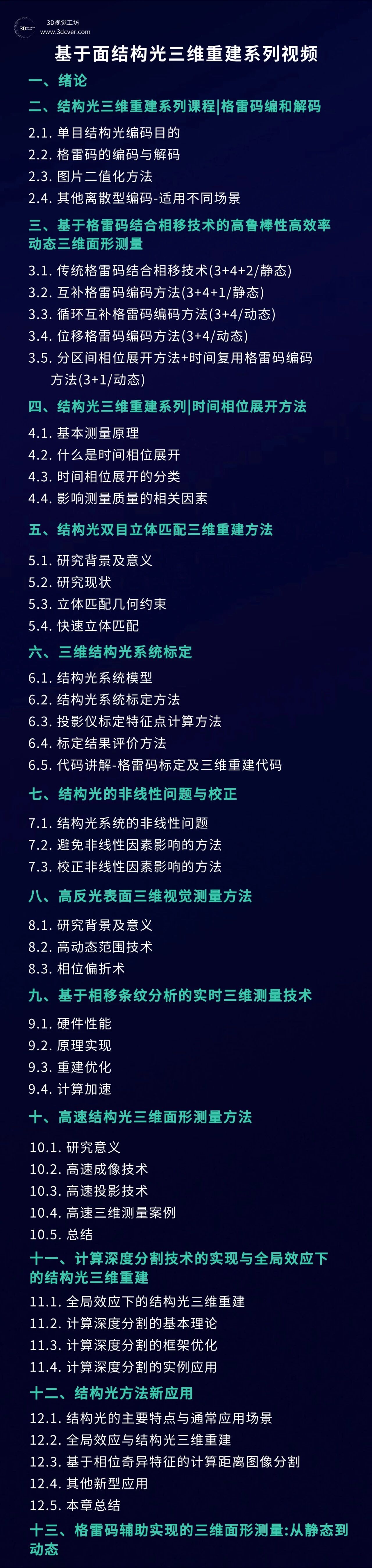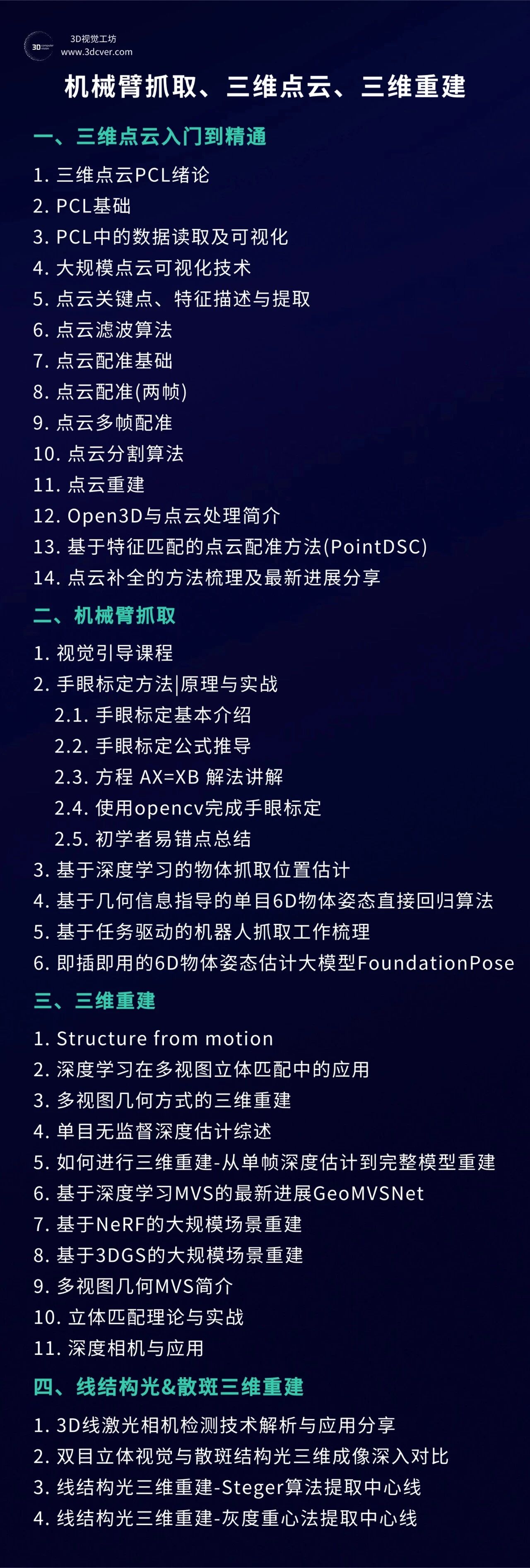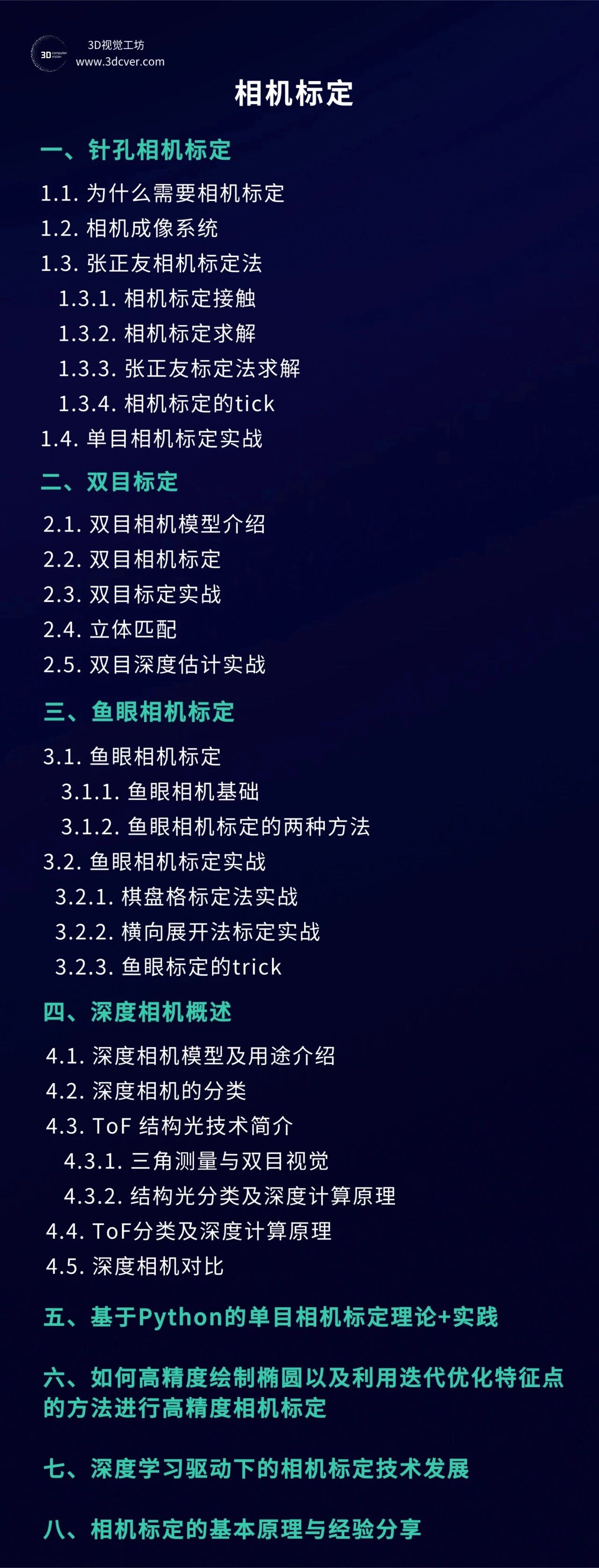 本课程主要包含两部分,分别是相机标定和3D视觉,相机标定包含单目、双目和鱼眼相机标定;3D视觉包含立体视觉、结构光和TOF,以立体视觉为主。课程提供对应数据与代码。