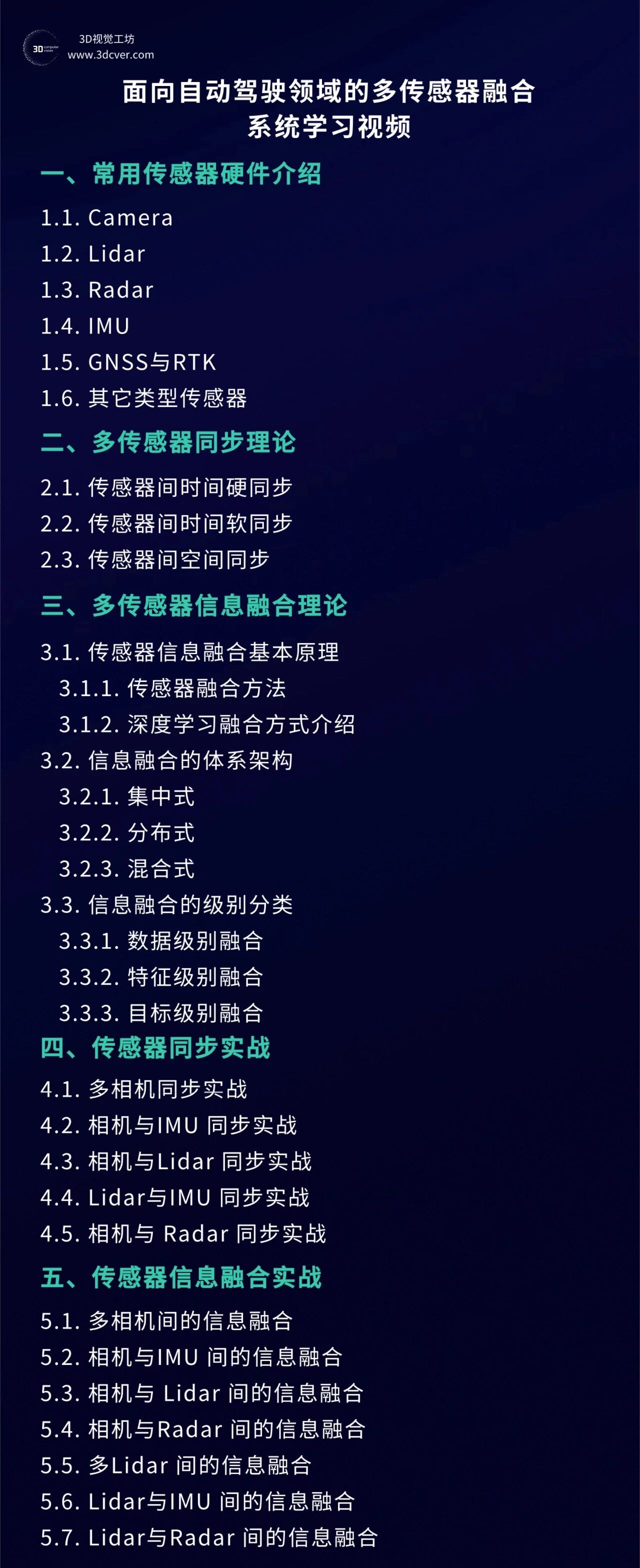 主要分两个大模块:理论篇和实战篇,理论篇部分主要介绍自动驾驶中常用的传感器硬件、传感器间的时间同步和空间同步以及多传感器间的信息融合理论知识;实战篇更多偏向工程应用,工程中传感器间同步与融合如何实现等。