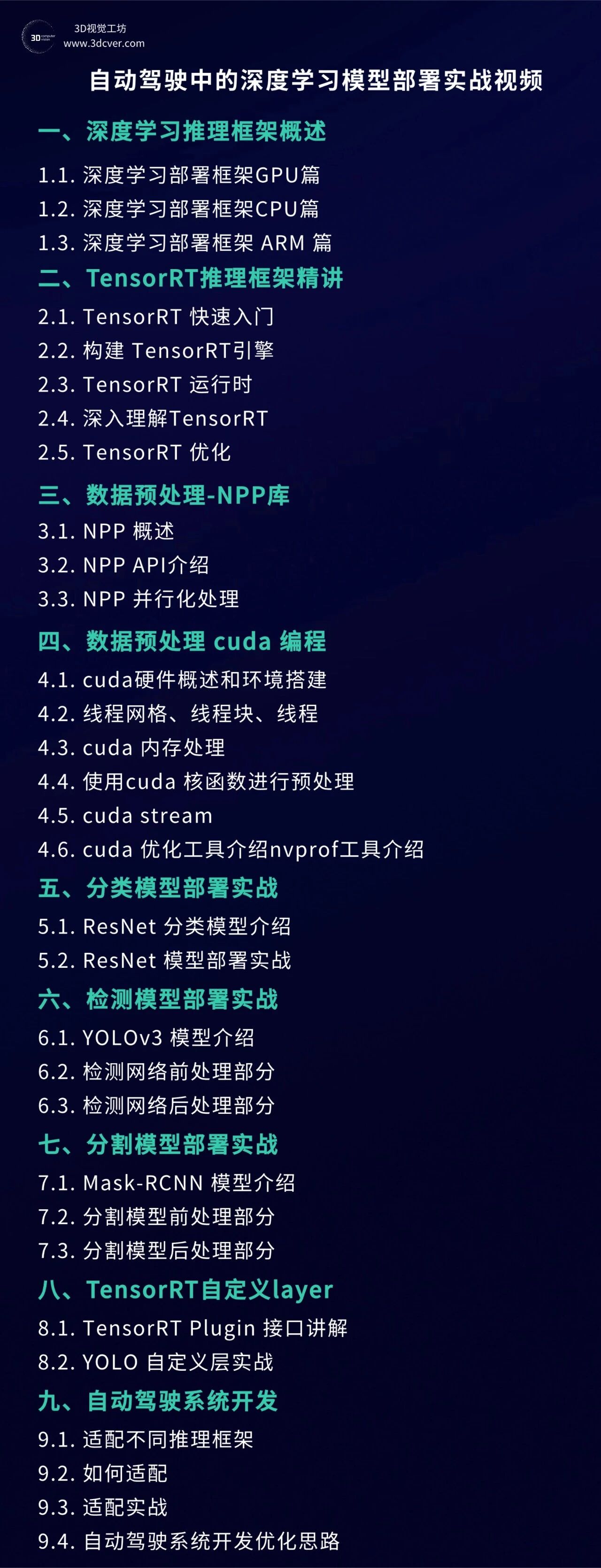 本视频教程将采用理论和实践相结合的思路,首先对TensorRT的编程模型以及GPU/cuda的相关知识进行讲解,带领大家达到知其所以然的程度;之后课程将用分类、检测、分割三个例子来展示详细编程流程,并给出相关代码,达到真正能落地的工业级分享。