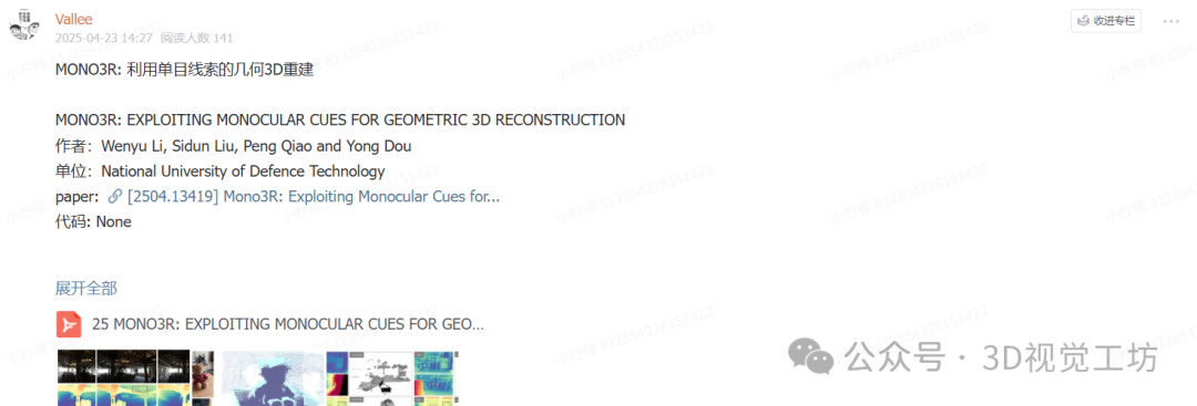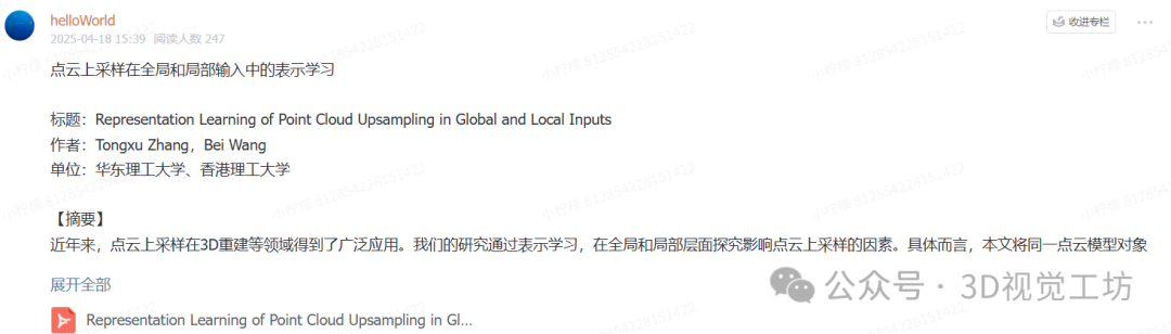 知识星球是一个高度活跃的社区平台,在这里你可以和相同研究方向的小伙伴一起探讨科研工作难题、交流最新领域进展、分享3D视觉最新顶会论文&代码资料、分享视频(讲解3D视觉重要知识点)、发布高质量的求职就业信息、承接项目等,当然还可以侃侃而谈,吐槽学习工作生活。