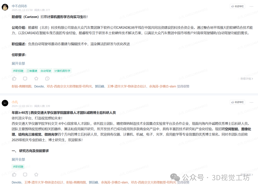目前已有6400+活跃成员,主要涉及方向:工业3D视觉、SLAM、自动驾驶、三维重建、无人机、具身智能、大模型等科技前沿方向。
