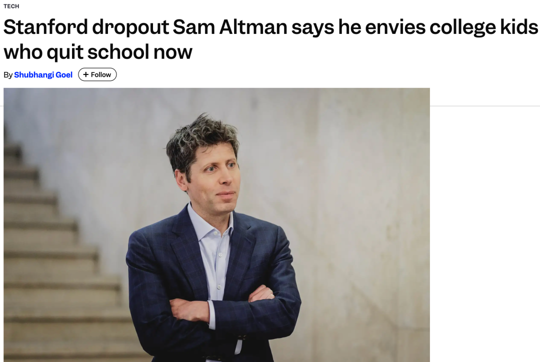 也就是前不久,同样是辍学创业过的奥特曼说,他有点羡慕现在这代退学的年轻人。