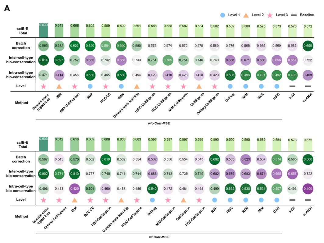 图B 表明,研究中将损失函数的设计分为了 3 个层级,第 1 级主要侧重于批次效应的去除(GAN、HSIC、Orthog、MIM、RBP、RCE),第 2 级侧重于生物学信息的保留(CellSupcon、IRM、Domain meta-learning),而第 3 级则是结合了第 1 级和第 2 级的联合优化,同时去除批次效应和保留生物信息(Domain Class Triplet loss、RCE-CellSupcon、RBP-CellSupcon、HSIC-CellSupcon、Orthog-CellSupcon、MIM-CellSupcon、RCE-CE)。