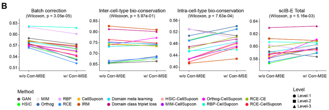 批次校正指标出现了轻微但显著的下降,这是可以理解的,因为 Corr-MSE 的目的是保留每个批次内部的结构,其中可能包含一些与批次相关的噪音,这必然会轻微影响批次的完全混合。细胞类型内生物学信息的保留出现了显著的提升。总分依旧实现了显著的净增长。
