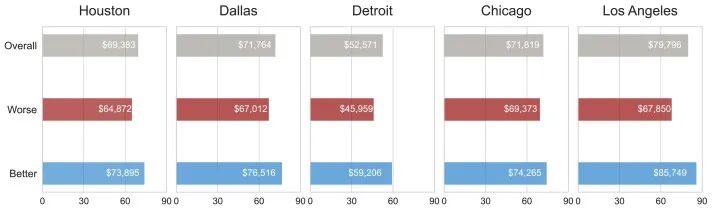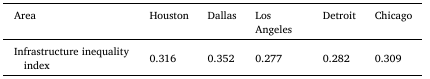 结果显示,基础设施供给水平在每个城市的普查区之间并非均匀分布。为了衡量基础设施供给不平等的程度,我们实施了基础设施不平等指数并在表 3 中展示了结果。该指数设计范围为 0 到 1,其中 0 代表无不平等,1 代表最大不平等。所有研究的城市都处于中等不平等状态,达拉斯呈现最高的基础设施供给不平等水平,而洛杉矶最低。将达拉斯与洛杉矶并列比较,达拉斯基础设施供给的不平等程度比洛杉矶高出 27%。这些结果显示了所提出的基础设施供给指标和方法在城市间和城市内比较方面的效用。