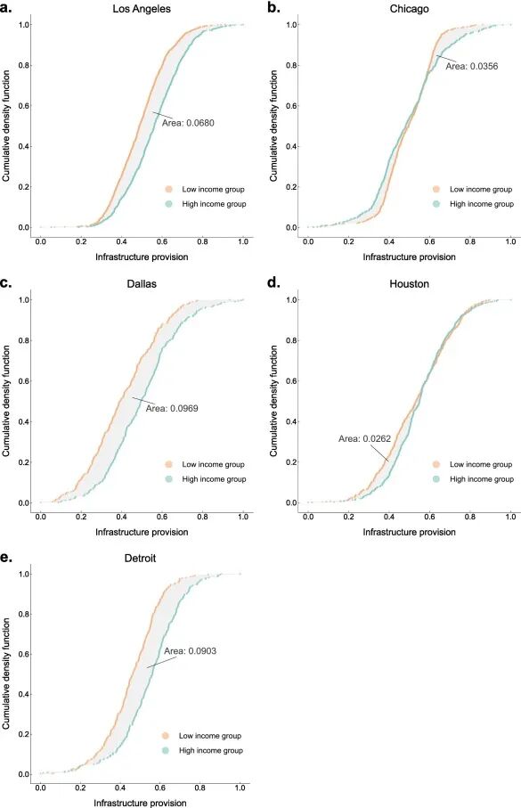 在接下来的步骤中,我们考察了不同收入群体间的基础设施供给差异。使用基础设施供给值的中位数,我们将每个城市的普查区分为两组:供给较好的组和供给较差的组。结果(图 5)揭示了基础设施供给组之间在收入方面的显著差异。供给较好组中的普查区具有较高的收入中位数,这在所有五个城市中是一致的。例如,在洛杉矶,基础设施供给较好的普查区的收入中位数比供给较差的普查区高出 27%,这是五个城市中最大的差距。有趣的是,洛杉矶的空间基础设施不平等程度最低,但其在不同收入群体间的基础设施不平等程度却最大。这一结果说明了在空间和收入差异两方面衡量和评估基础设施供给不平等的重要性。我们还根据收入中位数的第 50 个百分位数将每个城市内的普查区分为低收入和高收入组。图6展示了低收入与高收入组的基础设施供给分布。在达拉斯、洛杉矶和底特律,两个收入组之间的差异出现了一致的模式:高收入组具有更高水平的基础设施供给。例如,大约 20% 的高收入普查区显示出低于 0.4 的基础设施供给,而在低收入组中,这一比例约为 40%。这一发现揭示了不同城市在基础设施供给方面收入不平等的不同模式。此外,图6中两条曲线(低收入曲线与高收入曲线)之间的面积为跨城市比较基础设施供给收入不平等的程度提供了量化度量。如图6所示,达拉斯和底特律在基础设施供给方面的收入不平等程度最大,其次是洛杉矶。休斯顿虽然空间不平等程度第二高,但其在基础设施供给方面的收入不平等程度最低。这些结果凸显了在城市间和城市内比较中,同时评估空间和收入不平等的重要性。