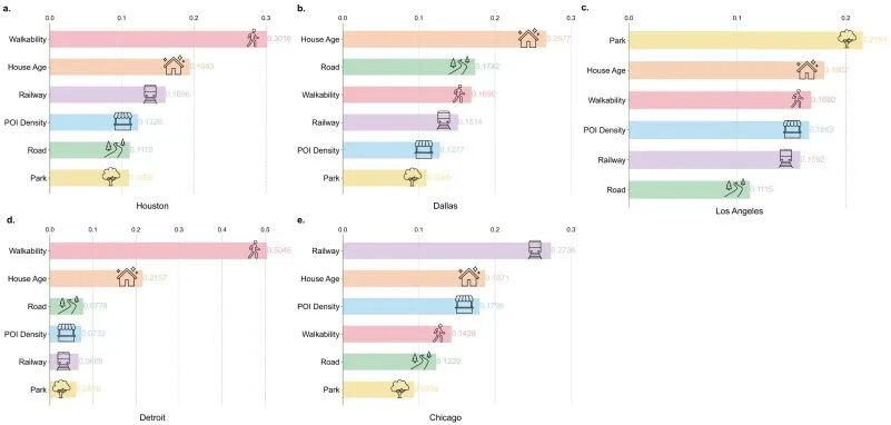 基础设施特征在塑造环境危害方面的贡献可能因特征和城市而异。在此,我们使用 XGBoost 来检验基础设施特征在解释不同城市地区环境危害变异性的程度。基于 XGBoost 方法,使用 SHAP 进行了特征重要性分析。SHAP 分析揭示了基础设施特征在不同城市区域塑造环境危害的详细程度信息。对于五个研究区域的多个基础设施特征,图1提供了预测环境危害类别时相对特征重要性的概览。每个条形显示了数据集的全局 SHAP 值,代表了特定基础设施特征对高环境危害的平均贡献。条形按重要性递减顺序堆叠,显示了特征重要性的排名。这些排名在不同城市间差异很大。例如,铁路的特征重要性在芝加哥市排名第一,而在达拉斯、洛杉矶和底特律则排在列表末尾。特征重要性在不同城市间的可变性表明,可能不存在一致的相对重要性模式。因此,必须使用基于机器学习的技术,在计算空间区域的基础设施供给得分时指定各种基础设施特征的权重,以捕捉城市特定的背景。