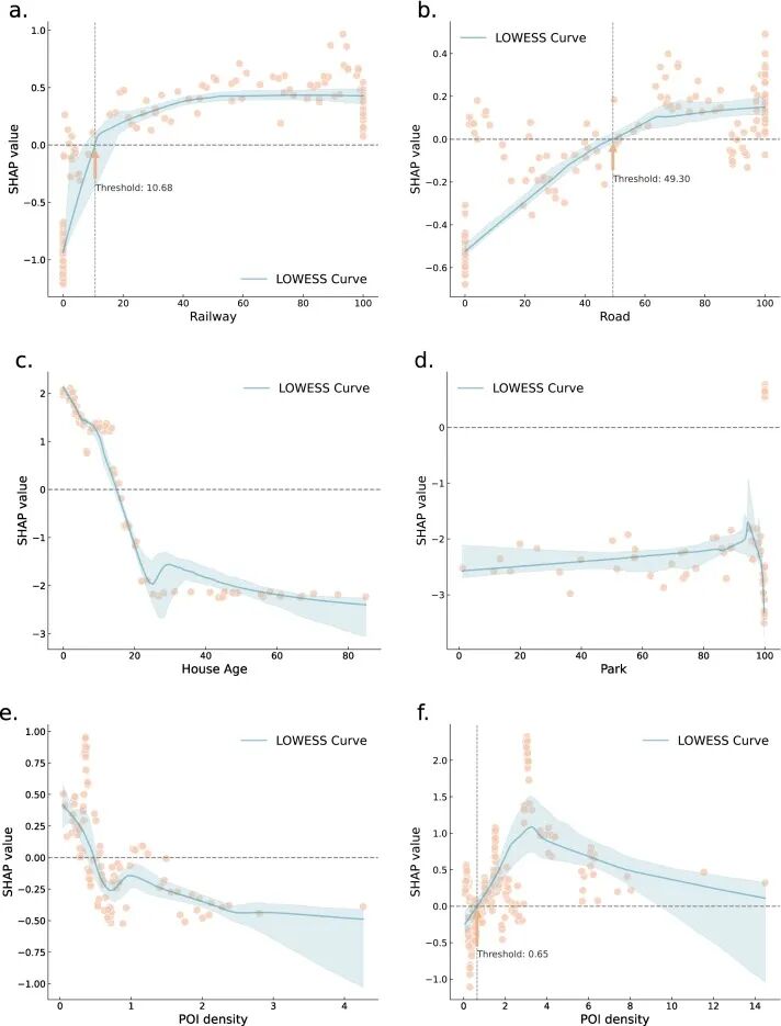 为了识别潜在的阈值,我们应用了局部加权散点图平滑(LOWESS)技术来拟合每个 SHAP 依赖图,遵循先前研究中的常见做法。LOWESS 是一种非参数回归技术,它对数据的局部子集拟合一条加权回归线(Cleveland, 1979)。拟合曲线揭示了特征值对预测的不断变化的贡献。曲线周围的阴影区域代表 95% 的置信区间。当拟合曲线呈现上升趋势并穿过 x 轴时,我们将交点解释为阈值。这个拐点代表 SHAP 值从负值转变为正值的位置,表明该特征的贡献从缓解环境危害转变为加剧环境危害。
