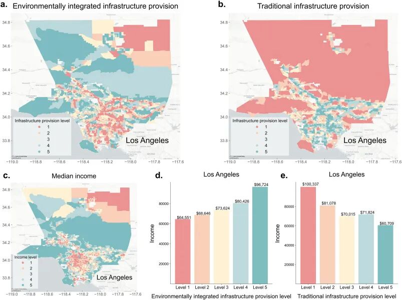 为了比较目的,我们使用相同的基础设施特征为五个选定的城市计算了传统的基础设施供给指数。每个城市内的普查区根据其基础设施供给得分的百分位数分为五类。图4 展示了洛杉矶的结果。比较传统和环境整合的基础设施供给得分的空间分布(图4a 和 b)揭示了显著差异。在传统方法下排名前 20% 的许多普查区,在环境整合框架下落入后 20%,反之亦然。为了量化这些差异,我们计算了所有类别中两种类型基础设施供给水平之间的重叠百分比(表2)。结果表明一致性有限。例如,在传统方法下被归类为 1 级的普查区中,只有 2.85% 在环境整合方法中仍保持在 1 级,而在传统方法下为 5 级的普查区中,只有不到 1% 在所提出的方法下也被归类为 5 级。值得注意的是,大约 67.21% 在传统供给评估中被归类为 5 级的普查区,在整合框架下落入 1 级。这些差异强调了在评估基础设施不平等时纳入环境考量的重要性。图4c 展示了洛杉矶普查区收入中位数的空间分布,这与环境整合的基础设施供给得分的模式密切吻合。这种关联进一步得到图4d 和 e 中条形图的支持。具体来说,具有较高收入中位数的普查区与较高的环境整合基础设施供给水平相关,而收入与传统基础设施供给之间的关联则呈现相反或不太一致的关系。