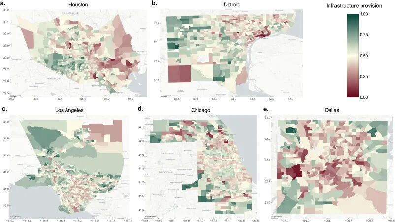 本研究最显著的区分之一是将环境考量纳入基础设施供给评估。我们承认传统观点认为更多基础设施有助于改善福祉,但同时强调基础设施的增长不应导致过度的环境负担。利用先前讨论的关于每个基础设施特征与环境危害之间关联的结果,以及基础设施在塑造环境危害中的相对重要性,我们计算了五个研究城市在普查区层面的基础设施供给指数。图3可视化了这些城市基础设施供给的空间分布。