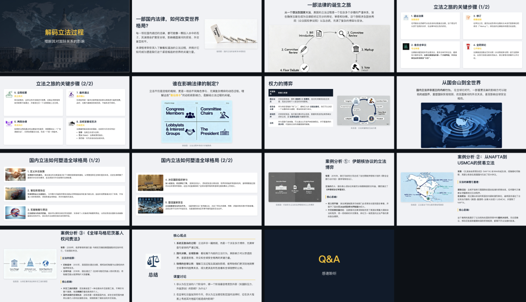 又或者制作一份高中课堂展示课件,主题为“解码立法过程:理解其对国际关系的影响”