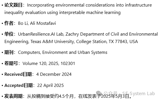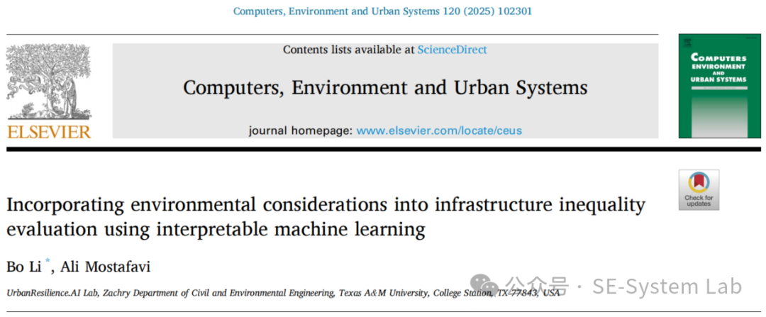 Li, B., & Mostafavi, A. (2025). Incorporating environmental considerations into infrastructure inequality evaluation using interpretable machine learning. Computers, Environment and Urban Systems, 120, 102301. https://doi.org/10.1016/j.compenvurbsys.2025.102301