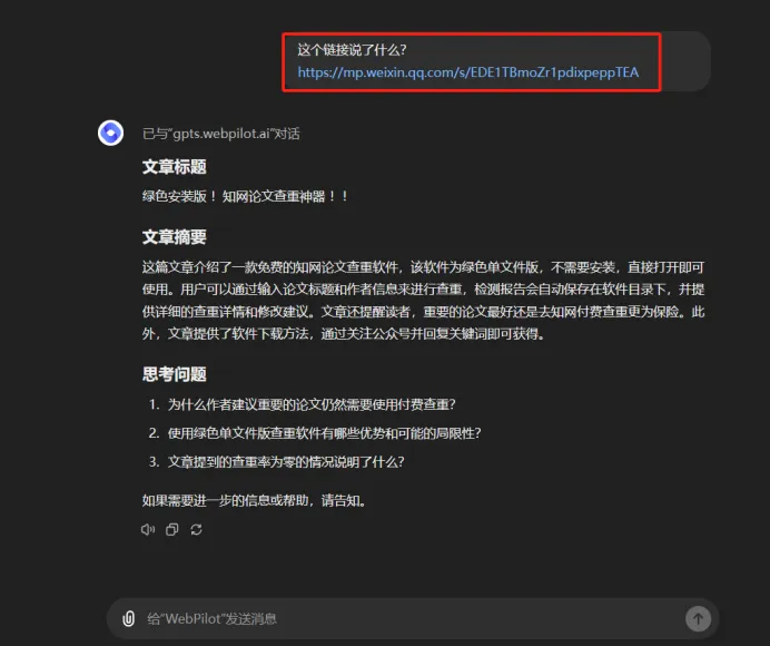 如果想要读取公众号外链,需要使用GPTs应用 : WebPilot  (这个非常好用,强烈推荐)