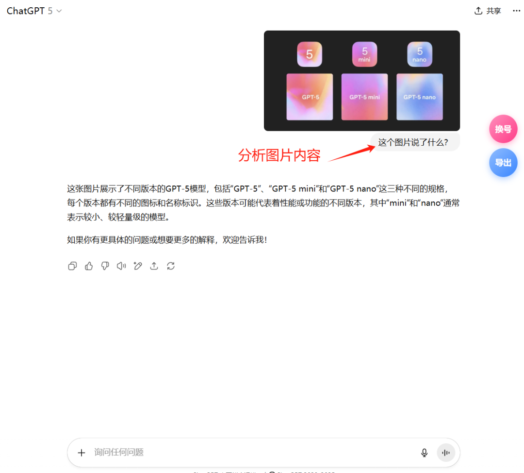 我们上传图片,然后根据图片的内容跟GPT-5提问,可以看到它能非常准确的分析出你图片的内容 。
