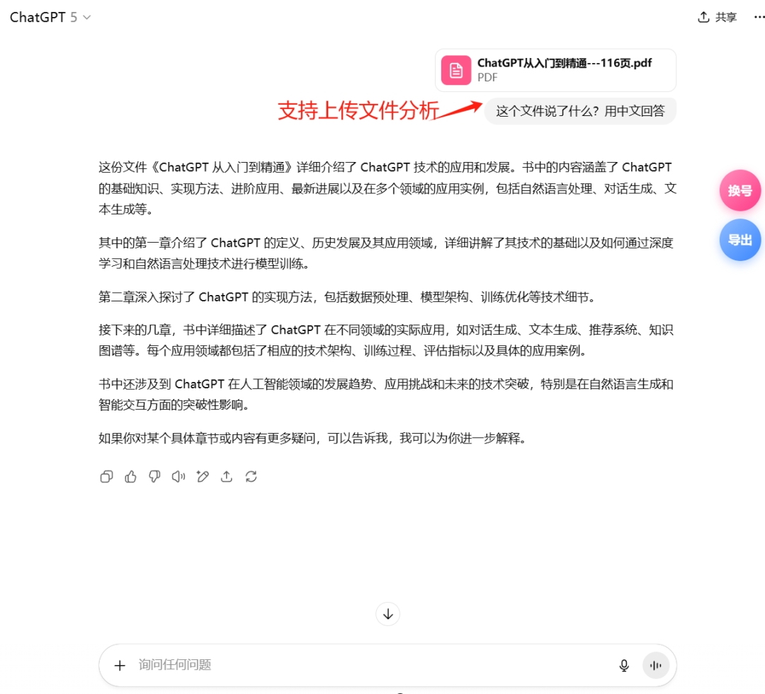 我们上传文件,然后根据文件的内容跟GPT-5提问,可以看到它能非常准确的分析出你文件的内容 。