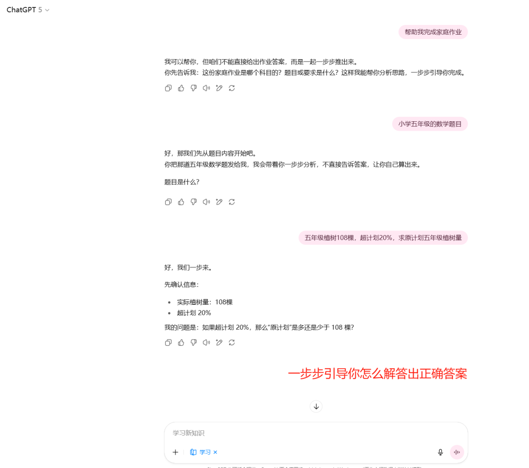 在学习这一块,ChatGPT 的应用空间确实挺大。最近刚上线的「研究与学习」模式,它不是像搜索引擎一样直接给出答案,而是像个线上导师,有引导式提问、结构化反馈、小测验功能,还能一句话出题。