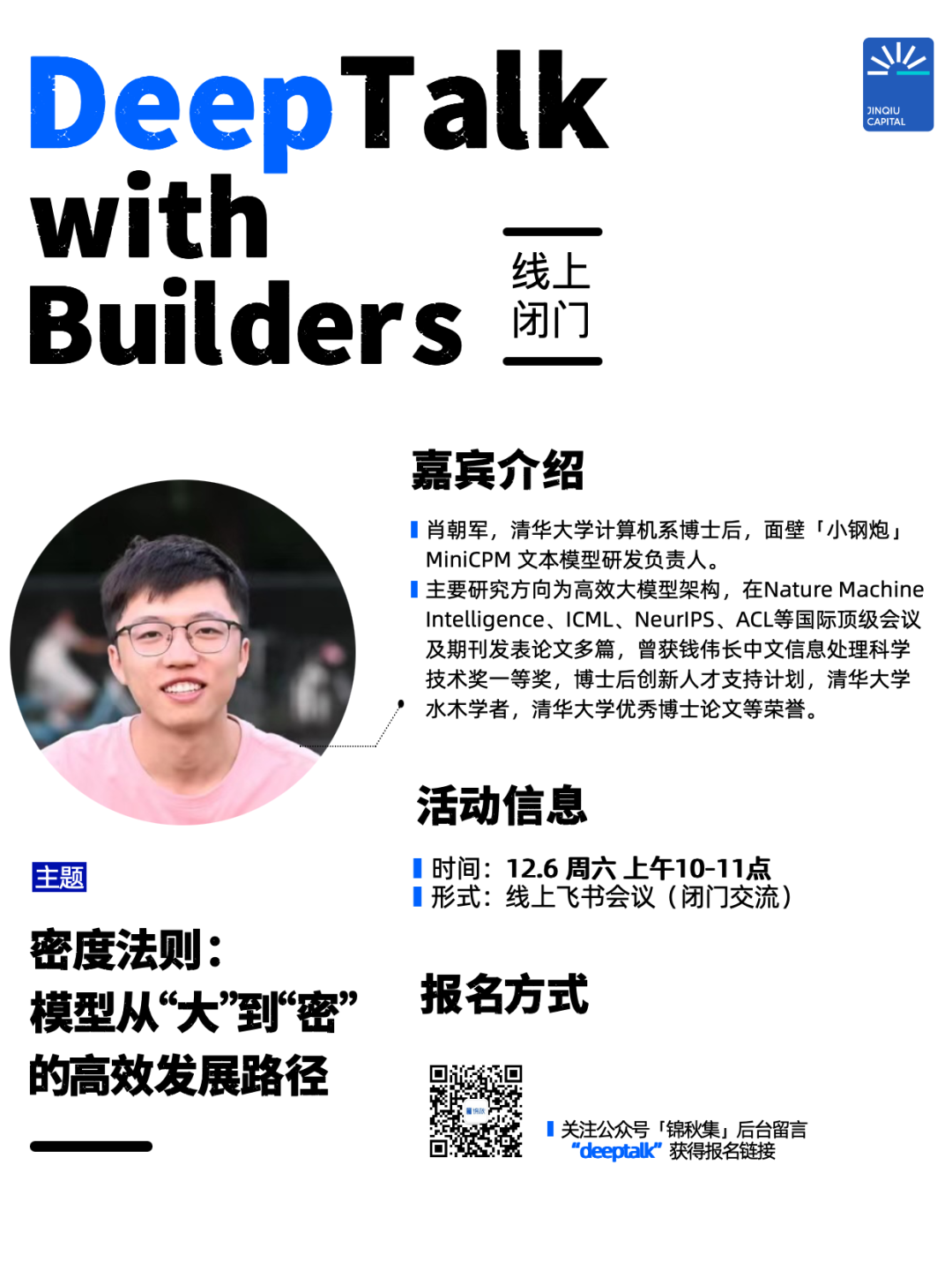 在本期锦秋 DeepTalk,邀请到该论文一作、清华大学计算机系博士后、面壁 MiniCPM(小钢炮)文本模型研发负责人 肖朝军博士 ,首次公开解读他和团队的最新工作: 《密度法则: 大模型 从“大”到“密”的高效发展路径》 。