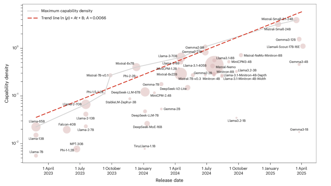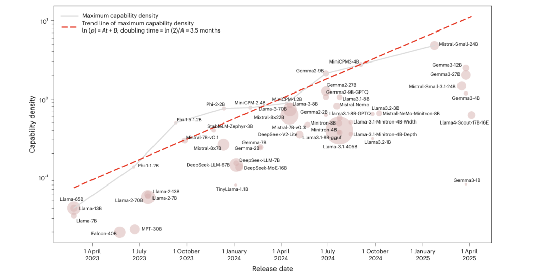 发表于 Nature Machine Intelligence 的 《Densing Law of LLMs》 提出了新的答案—— “能力密度”(capability density)与“ 密度法则 ”(densing law) 。该研究通过分析 51 个主流开源 LLM 的演进轨迹发现: LLM 的最大能力密度呈指数提升,约每 3.5 个月翻一番。 我们正从“做大模型”转向“做高效模型”。