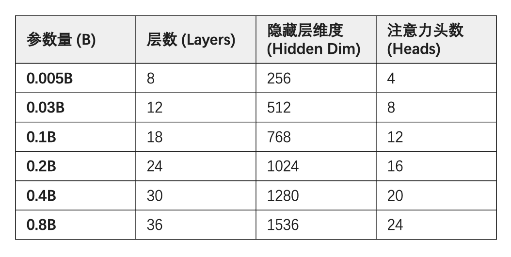 模型序列 : 训练了一系列参数量从 0.005B 到 0.8B 的小规模 Scaling 模型。