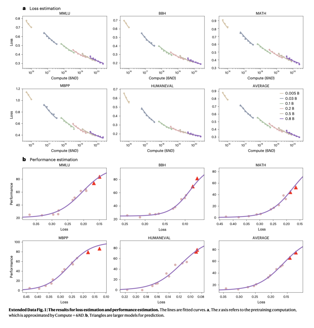 之间的关系。损失函数 是衡量模型压缩数据能力的平滑指标。 第二步:性能估计 (Performance Estimation) 拟合语言模型损失 与下游任务具体得分 之间的关系。通过建立 与 的映射,我们就能间接建立 与 的联系